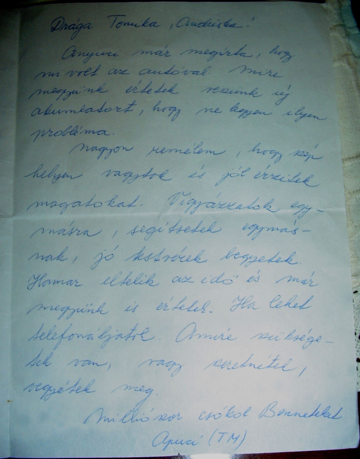 Reméljük szerencsésen odaérkeztetek és megtetszett nektek az a hely. Képzeljétek, Laci bácsi a Keleti pályaudvaron várt minket! Ti nem láttátok? Az úton nagyon esett az eső. Az autó pont a vámnál elromlott. A hídon kötéllel húzatott a Mónika férje. Legyetek jó kisfiúk! Írjatok és telefonáljatok! Vigyázzatok magatokra és egymásra!