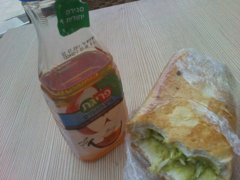 tam, hogy majd együtt megyünk ebédelni… ez itt nem szokás, legalábbis a mi csoportunkban. Végül lementem a nanoépület büféjébe, kétféle szendvics volt, ja meg meleg szendvicsek de azokat lassan sütik, én meg nem szeretek sokáig távol lenni a munkától. Szóval azon dilemmáztam, hogy a kék vagy a zöld címkéset válasszam. Ahelyett, hogy megpróbáltam volna kisilabizálni a héber írást a zöld mellett döntöttem. Be voltak fóliázva, s a töltelékük egyáltalán nem látszott ki. A zöldet vettem meg egy kis almalével. Meglepetésemre avokádó krém volt benne, uborka és csíra társaságában. Fujj, gondoltam először, de aztán elfogyasztottam, a kifli igazán ízletes volt a többi felejthető, csak a vizuális élmény volt megrázó.
