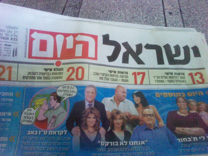 Ülök a peronon, s Pasztisan mondva csak nézek ki a fejemből… mintát veszek az izraeli társadalom HaShalom állomás nyujtotta keresztmetszetéből. Mindezt diszkréten, az Azrielben osztogatott Israel HaYom ingyenes újság hétvégi mega-tartalmas számával a kezembe. Még szerencse, hogy idén Londonban, gyakorlatot szereztem az újság mögüli kémkedés terén (lásd a lenti képen).
