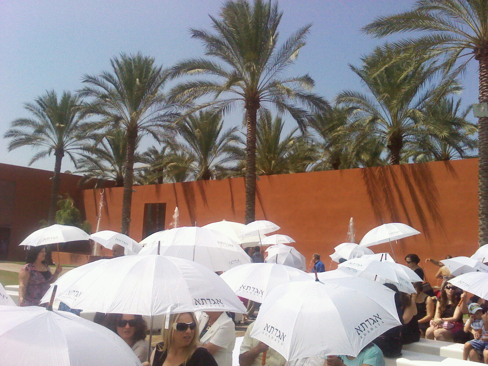 A hüpét (esküvői baldachin) a hagyományoknak megfelelően szabadtéren helyezték el. A háttérben feltűntek a Júdei-hegyek. Körben pálma- és olajfák, fehér bőr ülőalkalmatosságok, rendezett gyep… Miriam és Áron büszkén vezette a vőlegényt a hüpe alá, a menyasszony lenyűgözően szép volt. A násznép hatalmas napernyőkkel védekezett a tűző sugarak ellenl. “Esernyős” esküvőn még sosem jártam… 🙂