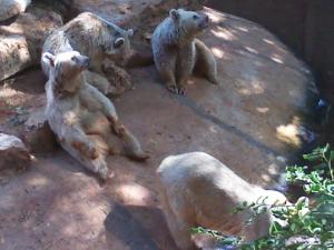 A nagy térkép előtt eltűnődtem, mi az, ami kimaradt… A mackók, kiáltottam fel! Macik nélkül nem mehetek haza! Irány a kis ösvény. Az első kifutóban két fekete, felismerhetetlen szőrpamacs, a másikban öt virgonc barna mackó.
