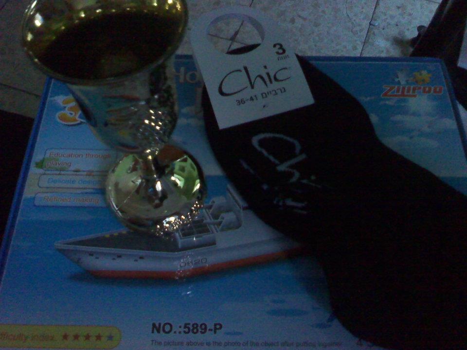 1. egy három sékeles, arany színű műanyag kiddus*-poharat, mégiscsak a Szentföldön van az ember, s hamarosan beköszönt a hetedik nap, a Sabesz