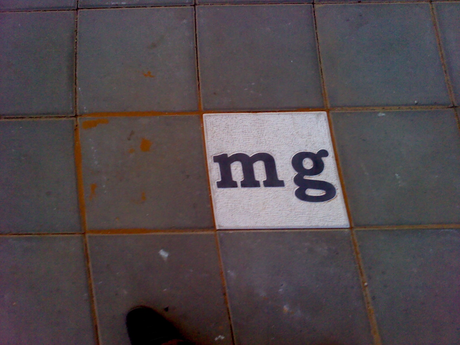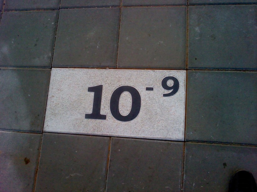 Hazatérőben szembesülhettem az elkészült tudományos-művészi alkotással. Botlókövek díszítik mostantól a nanotechnológiai triplex előtti teret. A 10-9-t még értettem, de a mg-nál már egy kicsit elbizonytalanodtam.