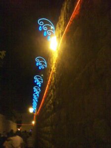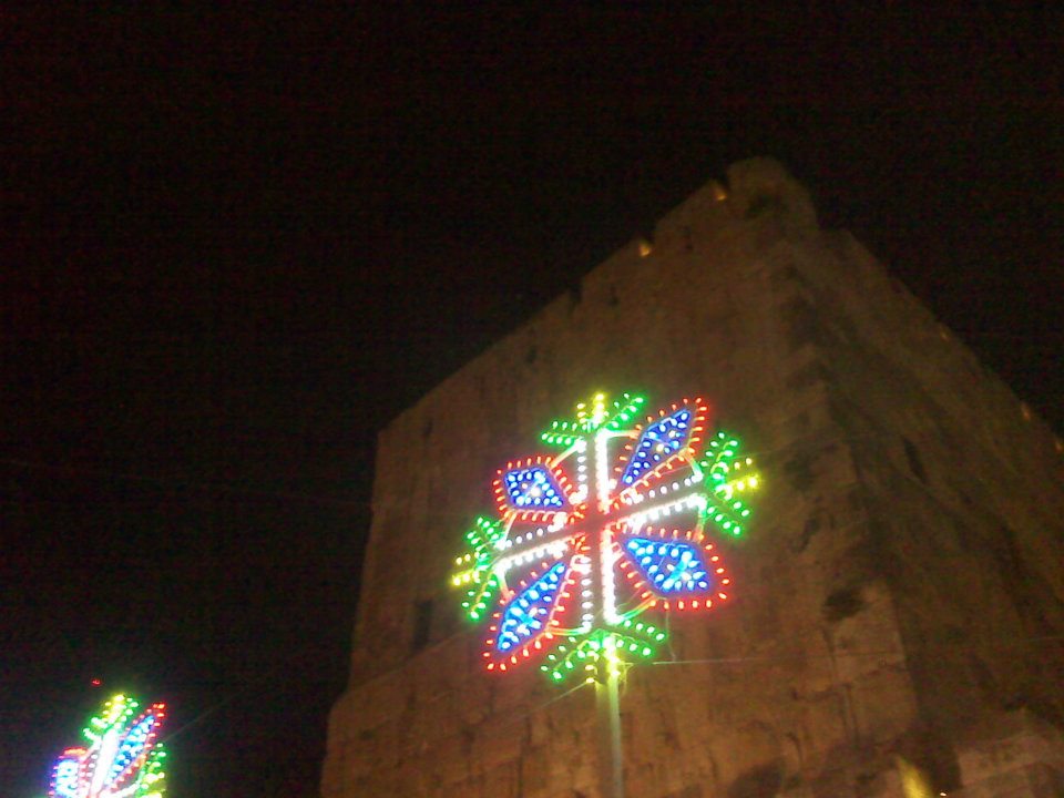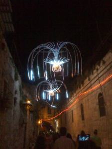 Villamossal száguldottunk végig a Jaffa utcán majd a Mamilla bevásárlóközponton át értük el a fényfesztivál kiinduló pontját a Jaffa kaput. A narancs, a kék és a zöld útvonalon kínált szemet-gyönyörködtető látványt a több állomásos, az Óvárost behálózó fényáradat. Különleges lámpák, meglepő vetítések próbálták elvarázsolni a szent helyeket felkereső ezreket. Sokszor mozdulni sem lehetett a szűk sikátorokban. Párszor jártam már az Óváros macskaköves utcáin, ennyi nézelődővel még sosem találkoztam.