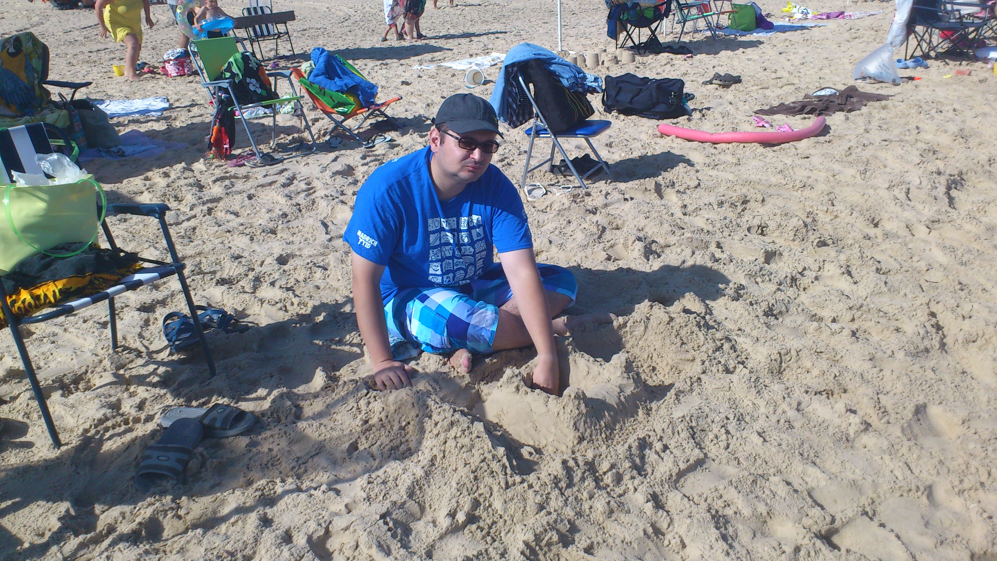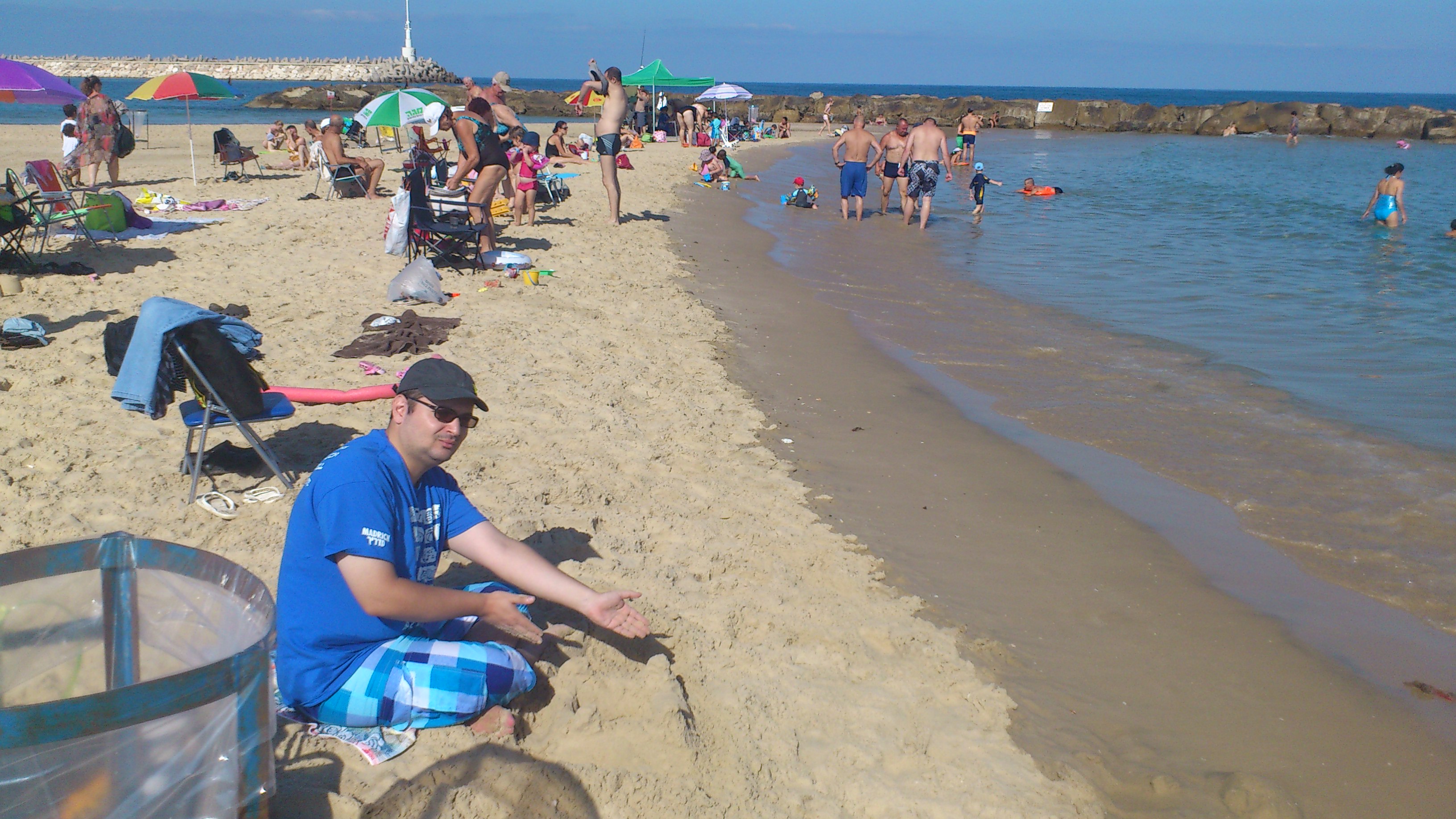 Visszatérve Ashkelonba… a nap süt, 36 °C, családok áradata a tengerparton. Kicsit zavaros a víz de azért élvezhető… erős késztetést érzek a homokvár építésre…