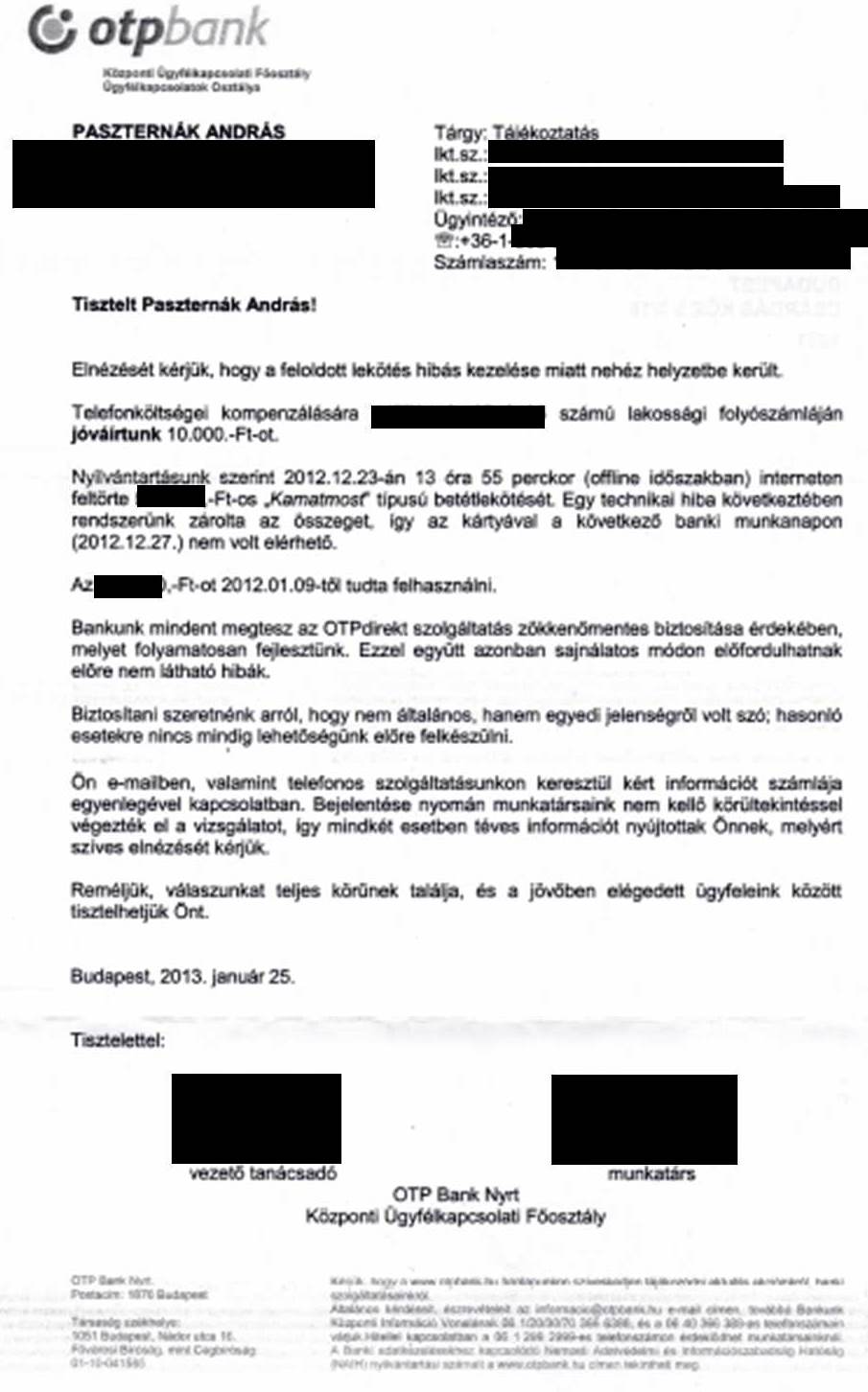 Többen érdeklődtek, mi lett az OTP-és történet vége. A mai posta hozta a hivatalos választ. Azt azért megjegyezném, elektronikusan is elküldhették volna, nem csak hagyományos levélben a pesti címemre. S zárásként mi mást kívánhatok az érintett OTP-és kollégáknak – “Bejelentése nyomán munkatársaink nem kellő körültekintéssel végezték el a vizsgálatot, így mindkét esetben téves információt nyújtottak Önnek, melyért szíves elnézését kérjük.” – éljenek át egyszer ők is hasonló helyzetet valahol távol az otthontól, várjanak napokat a saját pénzükre, kiszolgáltatva és bizonytalanságba taszítva! Remélem az ő bankjuknál akad majd valaki, aki segíteni tud és akar is.