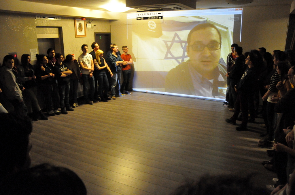 Szóval úgy négy óra tájékán kivirult az arcom, rávettem magam az egész nap halogatott borotválkozásra, elkezdtem megfelelő hátteret fabrikálni egy hatalmas izraeli zászló és egy Szarvas-logós táska felhasználásával. Készítettem egy előre felvett beszédet is, a biztonság kedvéért, ha az Internet vagy a Skype gyengélkedne.