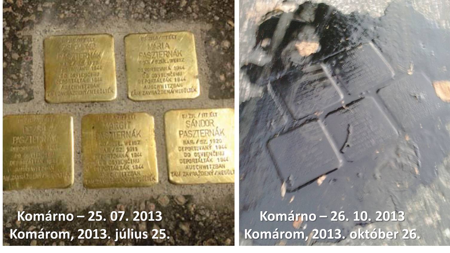 A nyáron, 69 évvel az elhurcolásuk után, “visszatértek” a dédszüleim és megölt gyermekeik a Tolnai utca helyén lévő Komenský utcába. Amikor szeptemberben Izraelből hazajöttem, első komáromi utam hozzájuk vezetett. Megálltam az emlékezés kövei előtt, s hittem egy emberöltőnyire mindattól, ami velük történt, jár ennyi. Három hónap jutott nekik “odahaza”. Ennyi engedtetett meg az emlékező botlóköveknek, mielőtt valaki vagy valakik szurkot öntöttek rájuk.