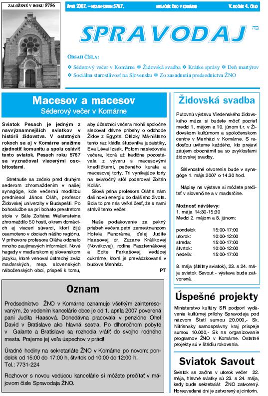 A Komáromi Zsidó Hitközség 1996-ban hozta létere ingyenes hírlevelét, a Hitközségi Híradót. A havonta megjelenő kiadvány a régió zsidó vonatkozású eseményeiről, ünnepeinkről tudósít lassan kilenc éve. 2003-tól regisztrált regionális újságként jelenik meg.